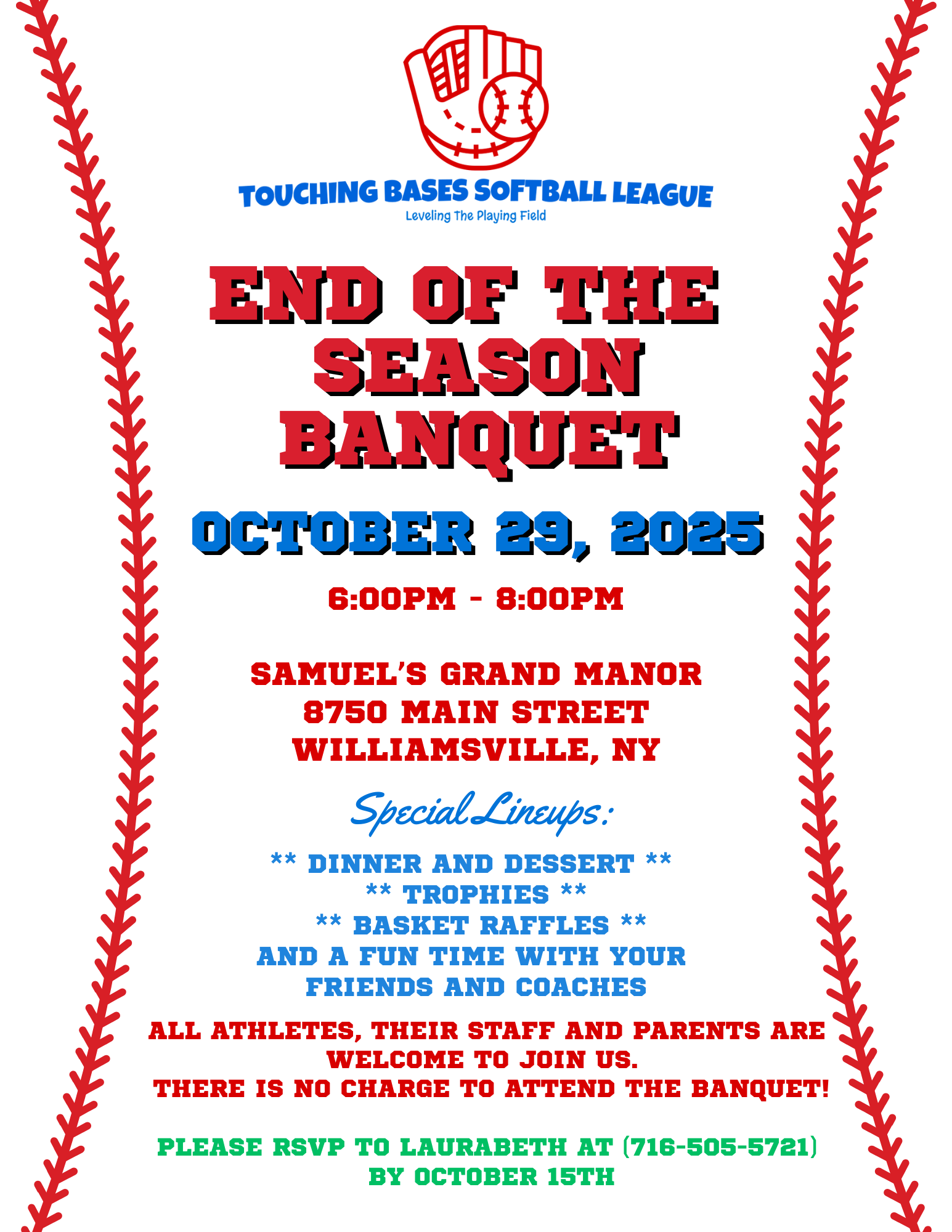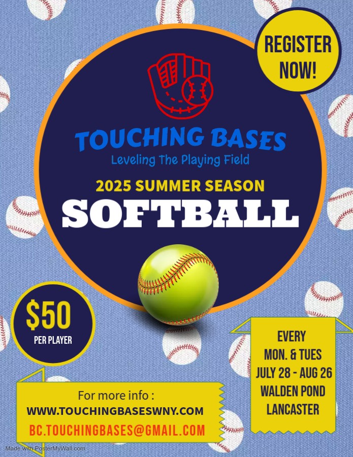 We will be using diamonds 4,5,6 & 7 every week with the exception of August 5th and 6th. When entering the park from Walden Avenue, turn left at the stop sign and continue back to the diamonds just past the football field. Diamonds 4 & 5 will be on the left and diamonds 6 & 7 will be on the right.